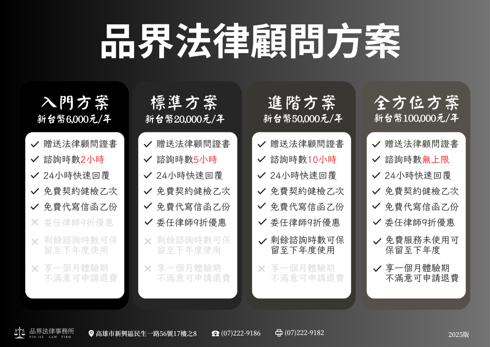 我們提供 2025企業法律顧問方案,由專業團隊協助: